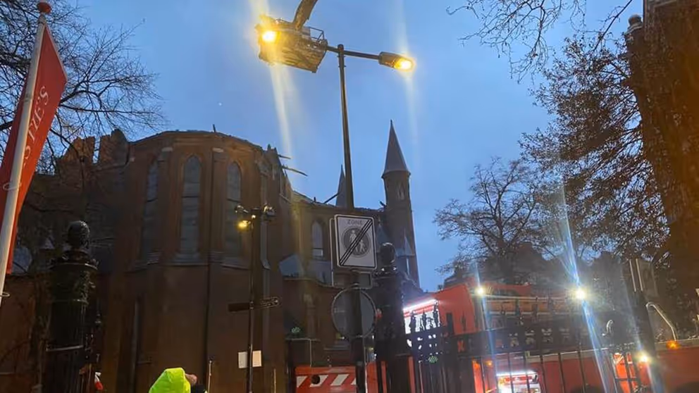 Met een thermische camera op de mast van het voertuig was ook de bebouwing te scannen. Voorkomen moest worden dat de brand oversloeg naar belendende percelen. De hoogwerker werd ook gebruikt om de muren van de kerk aan de binnenkant te inspecteren.